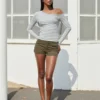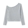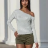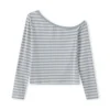 Women Oblique Neck T-shirt Long Sleeve Striped Slim Fit Ladies Fall Tops Shirts Streetwear