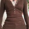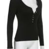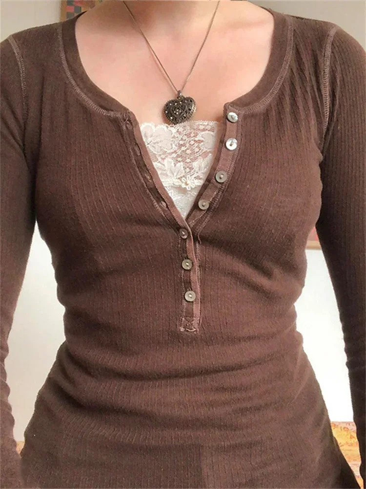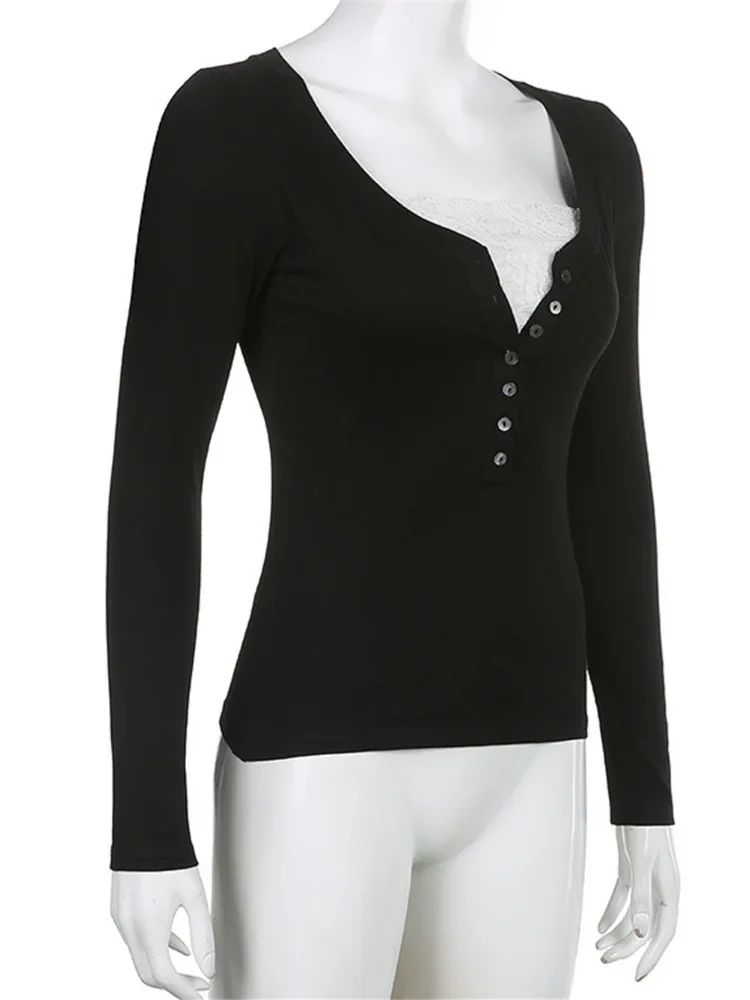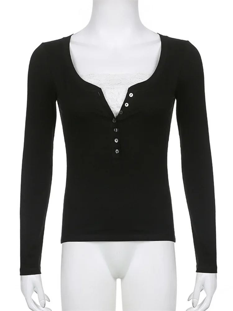 Women Long Sleeve Tops Autumn Vintage Casual Lace Patchwork 1/2 Button Pullover Shirt Club Streetwear