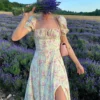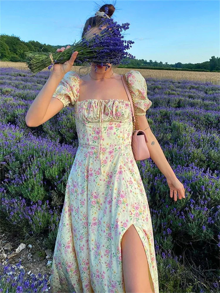Women Summer Vintage Floral Dress Puff Short Sleeve Square Neck Split Long Dress for Eleagnt Party Beach Bohemian Dresses
