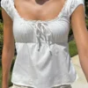 Women’s Cap Sleeve Tops Solid Color Lace Trim Tie Front Bow Square Neck T-shirt for Summer Y2K Retro Shirts