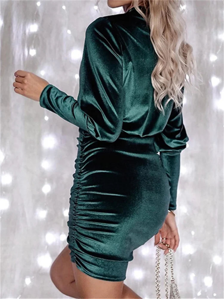 Women’s Fall Velvet Bodycon Dress Solid Color Round Neck Lantern Long Sleeve Ruched Mini Dress