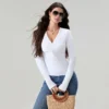 Women’s Spring Slim Fit Tops Solid Color Long Sleeve Wrap V-Neck T-Shirt Streetwear