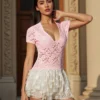 Women’s Summer Lace Crop Tops Short Sleeve Deep V-Neck Sheer Mesh Slim T-Shirts Clubwear
