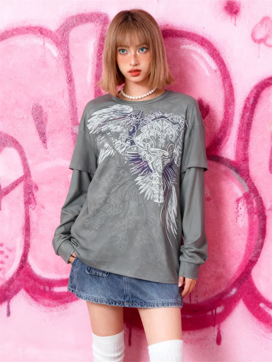 Women’s Tops Sweatshirts Long Sleeve Round Neck Grunge Graphic Print Loose Shirts Fake Two-Piece Streetwear Tops Fall