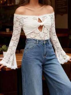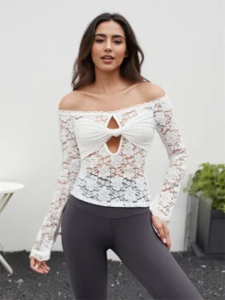 Women Off Shoulder Lace Tops Slim Front Knot Cut Out Long Sleeve Sheer Shirts Trendy Streetwear