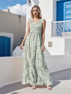 Women Sleeveless Dress Summer Casual Tie up Strap Floral Print Ruffled A-Line Party Dress for Beach Club Streetwear