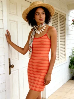 Women Stripe Knit Dress Spaghetti Strap U Neck Bodycon Mini Dresses Dopamine Fashion Bohemian Casual Dress for Beach Vacation